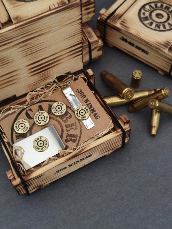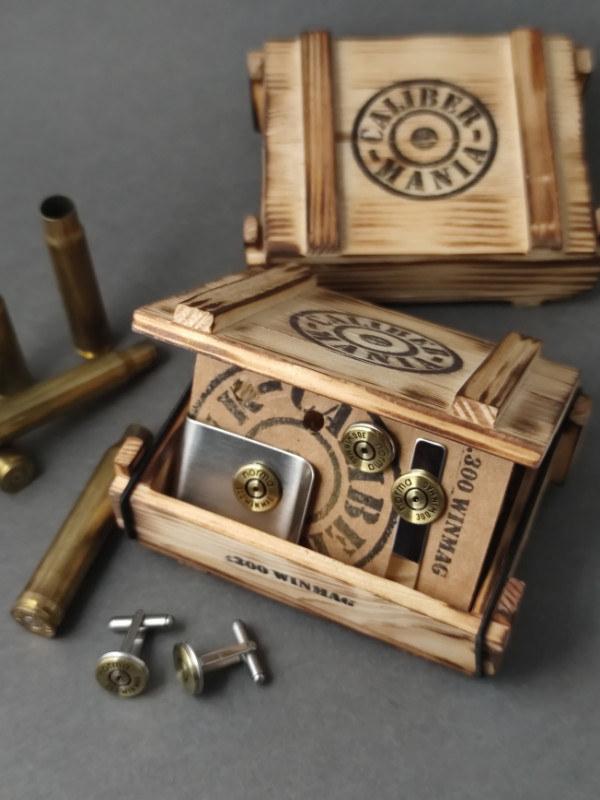 A szett tartalma: 1 pár mandzsettagomb, 1 pénzcsipesz, egy nyakkendő csipesz, 1 kitűző. Azonos kaliberekből, fenyő lőszeresládában.