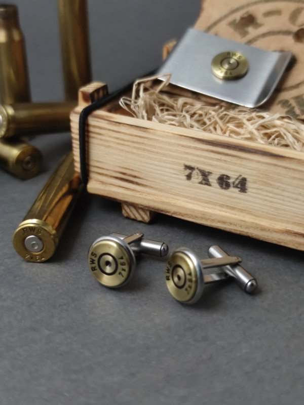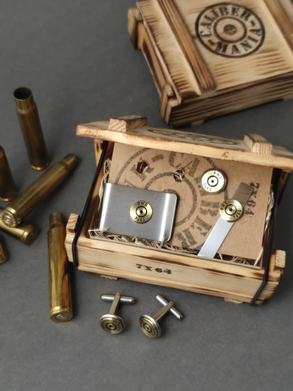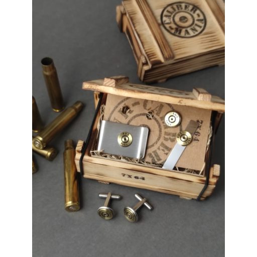 A szett tartalma: 1 pár mandzsettagomb, 1 pénzcsipesz, egy nyakkendő csipesz, 1 kitűző. Azonos kaliberekből, fenyő lőszeresládában.