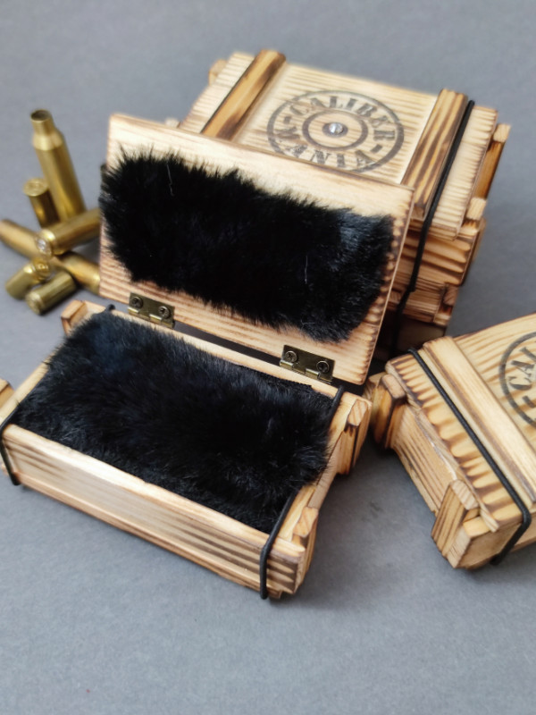 A tetején csak egy kis csillogás, az igazi meglepetés a pihe-puha szőrmével bélelt fa ékszeresládában a lőszerből készült ékszer.