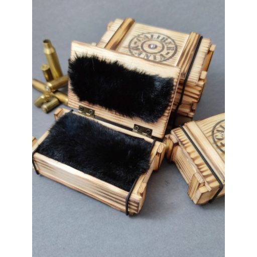 A kis lőszeresláda a nagy katonai ládák mintájára készült, hogy stílusában passzoljon a töltény ékszerekhez. Tökéletesen kiegészítő és igazi ajándékká varázsol egy apróságot is. Stílus, meglepetés, és biztonság egyben.
