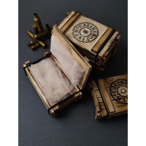 A kis lőszeresláda a nagy katonai ládák mintájára készült, hogy stílusában passzoljon a töltény ékszerekhez. Tökéletesen kiegészítő és igazi ajándékká varázsol egy apróságot is. Stílus, meglepetés, és biztonság egyben.