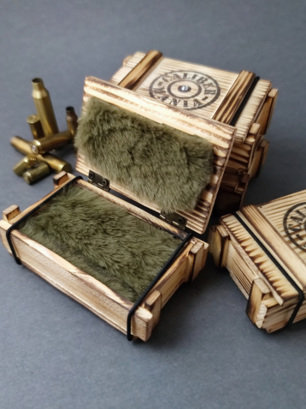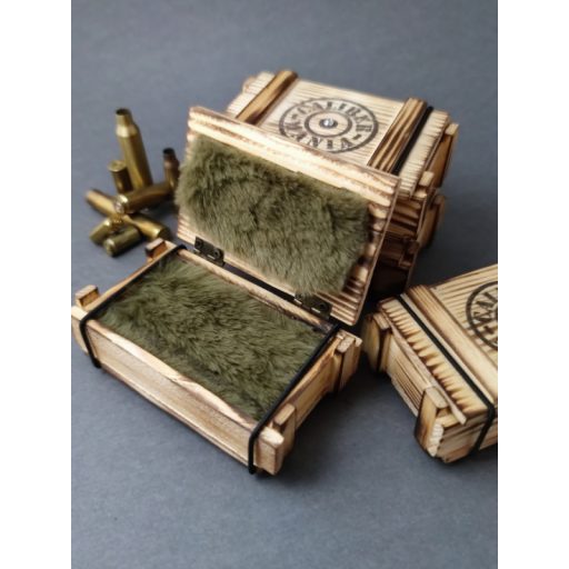 A kis lőszeresláda a nagy katonai ládák mintájára készült, hogy stílusában passzoljon a töltény ékszerekhez. Tökéletesen kiegészítő és igazi ajándékká varázsol egy apróságot is. Stílus, meglepetés, és biztonság egyben.