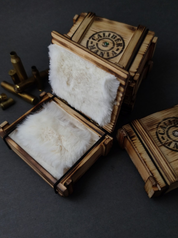 A tetején csak egy kis csillogás, az igazi meglepetés a pihe-puha szőrmével bélelt fa ékszeresládában a lőszerből készült ékszer.