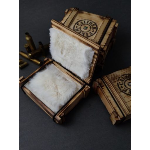 A kis lőszeresláda a nagy katonai ládák mintájára készült, hogy stílusában passzoljon a töltény ékszerekhez. Tökéletesen kiegészítő és igazi ajándékká varázsol egy apróságot is. Stílus, meglepetés, és biztonság egyben.