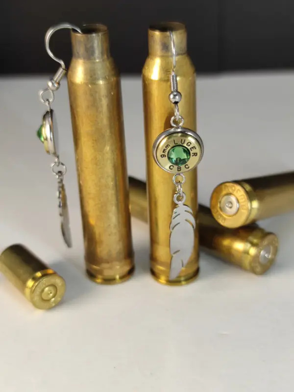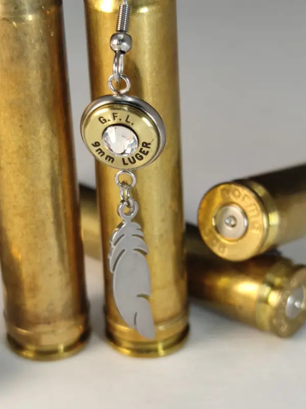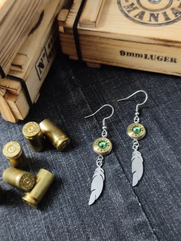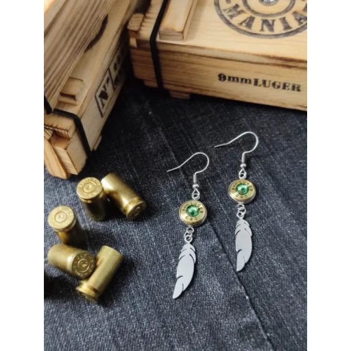 9mm Luger töltény fülbevaló tollas-csüngős, választható kristály