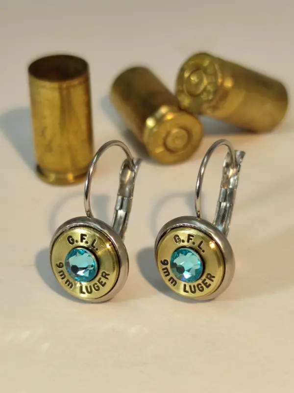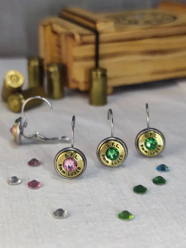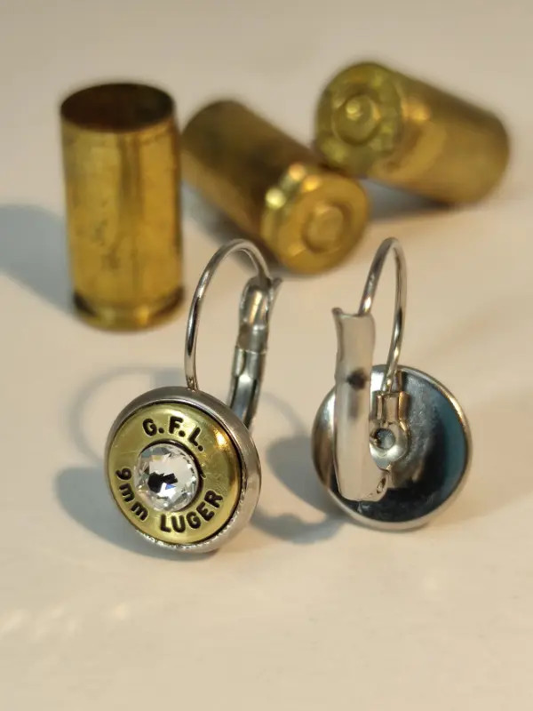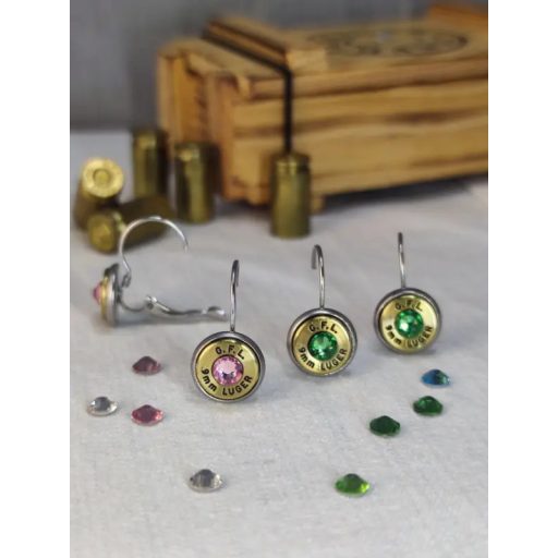 9mm Luger töltény fülbevaló franciakapcsos, többféle kristállyal
