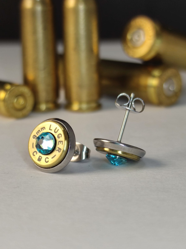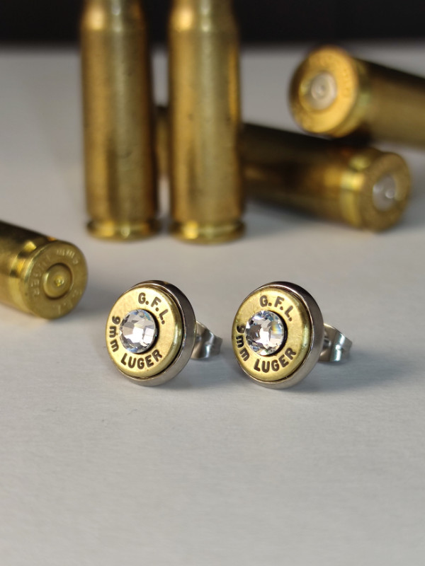 9mm Luger töltény fülbevaló bedugós, választható kristály