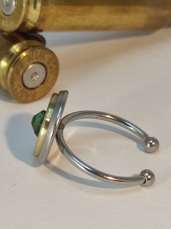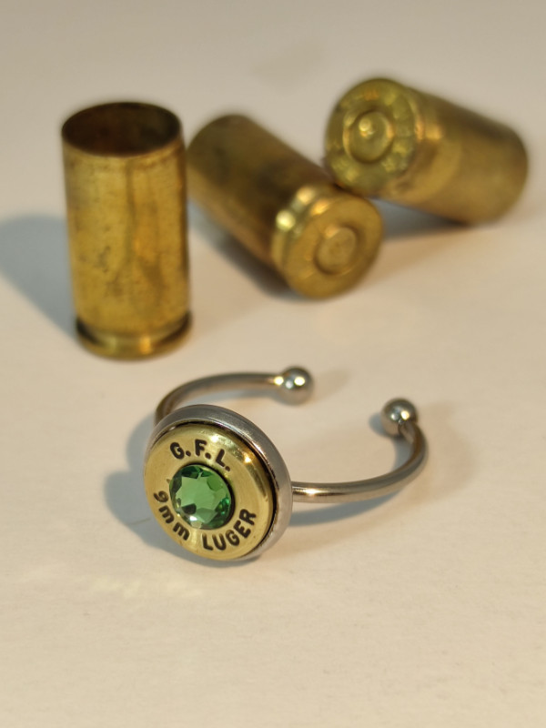 Igazi 9 mm Luger töltényhüvelyből készítettem ezt a csinos gyűrűt, egy kis extra csillogással.