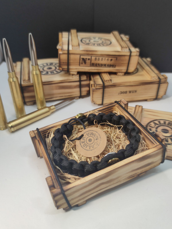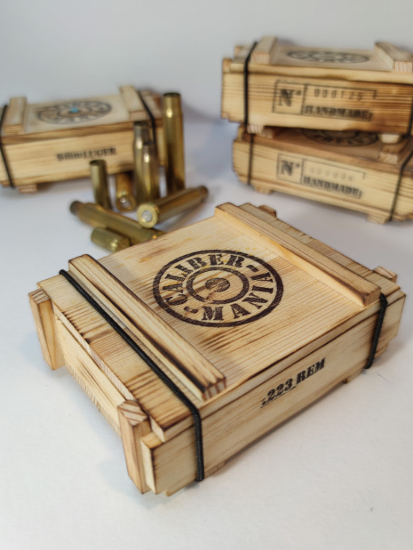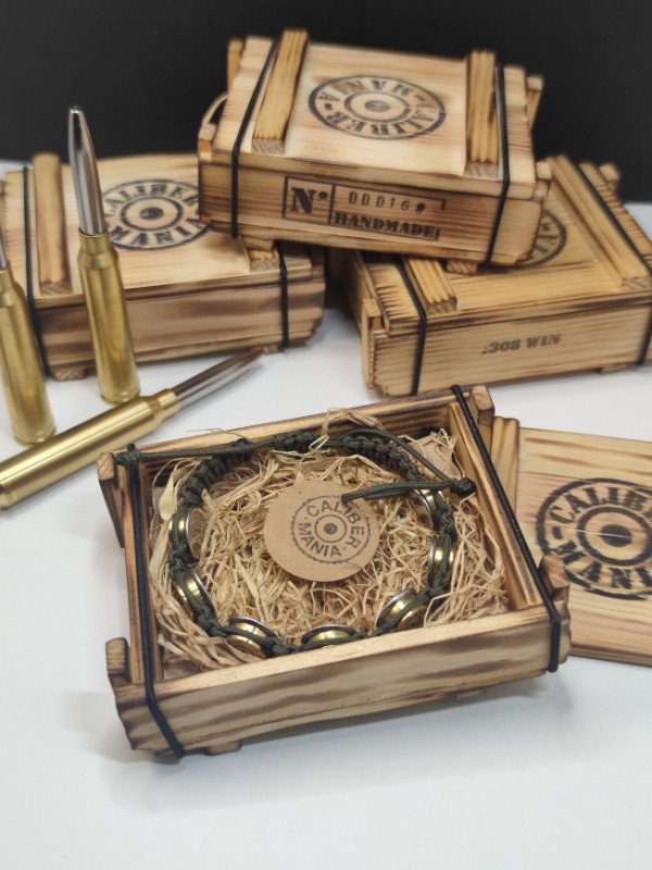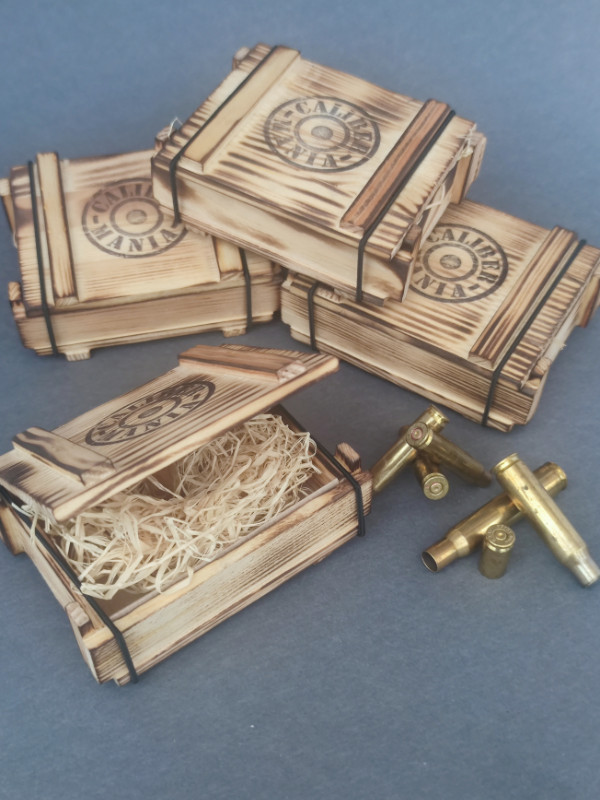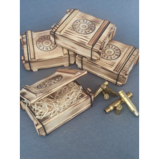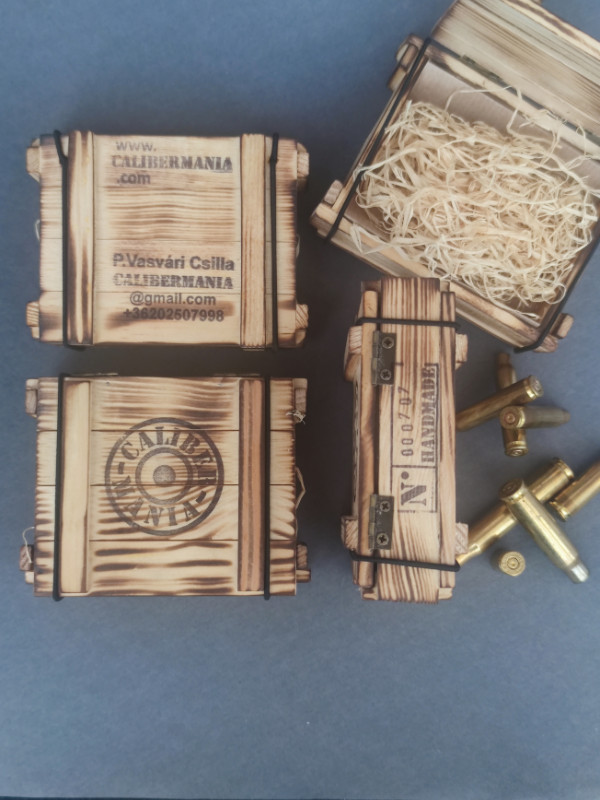 A kis lőszeresláda a nagy katonai ládák mintájára készült, hogy stílusában passzoljon a töltény ékszerekhez.