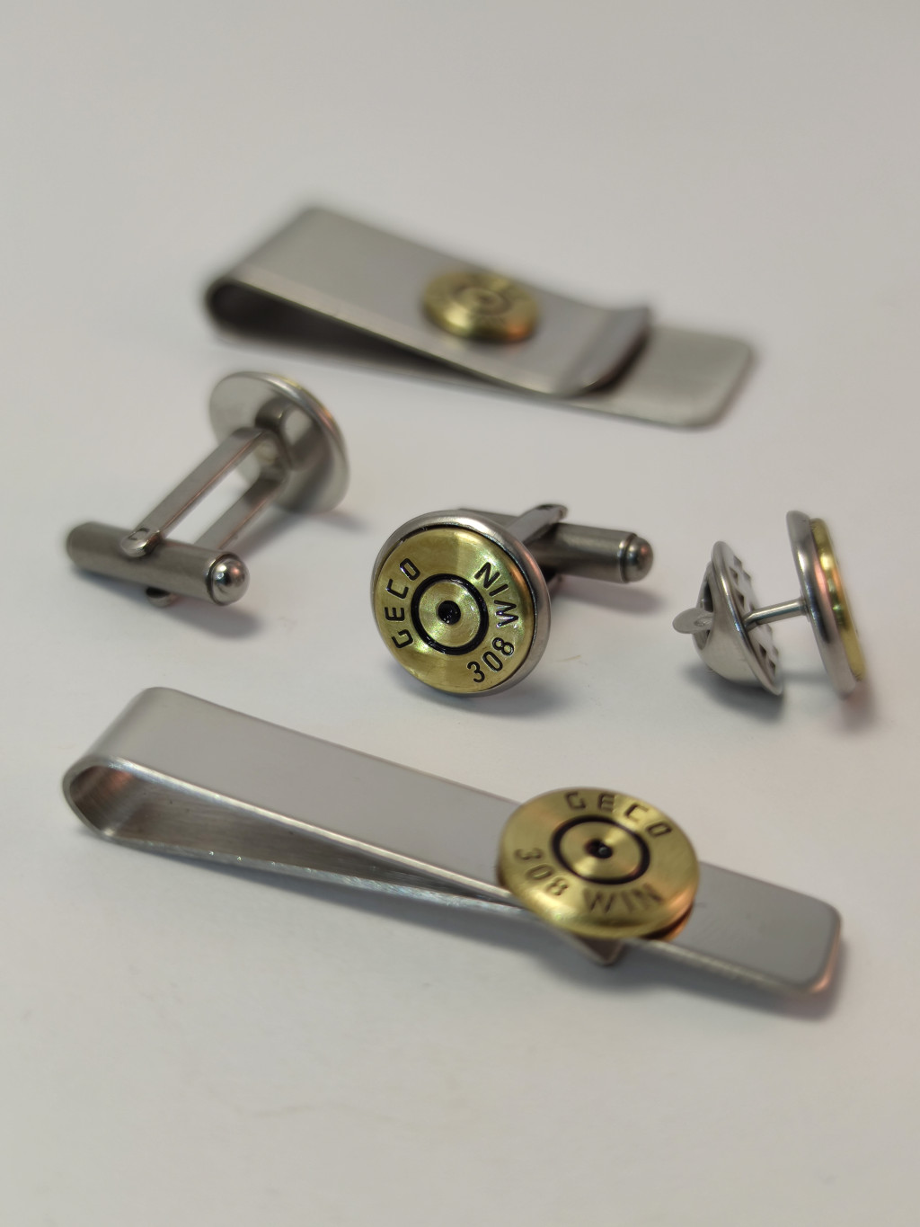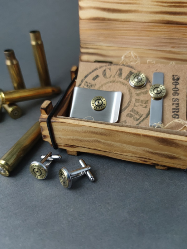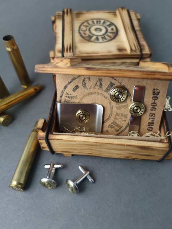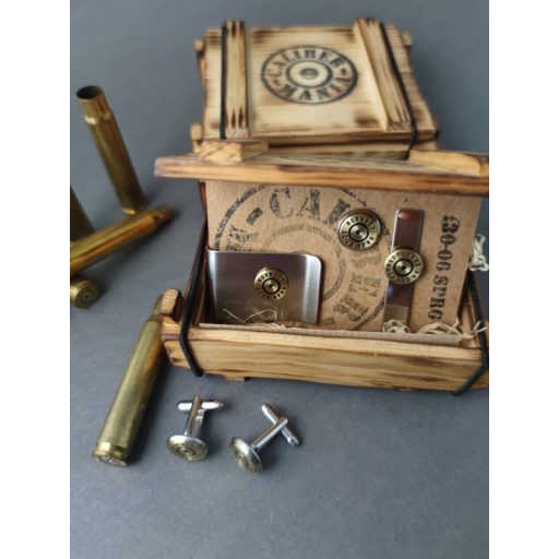 A szett tartalma: 1 pár mandzsettagomb, 1 pénzcsipesz, egy nyakkendő csipesz, 1 kitűző. Azonos kaliberekből, fenyő lőszeresládában.